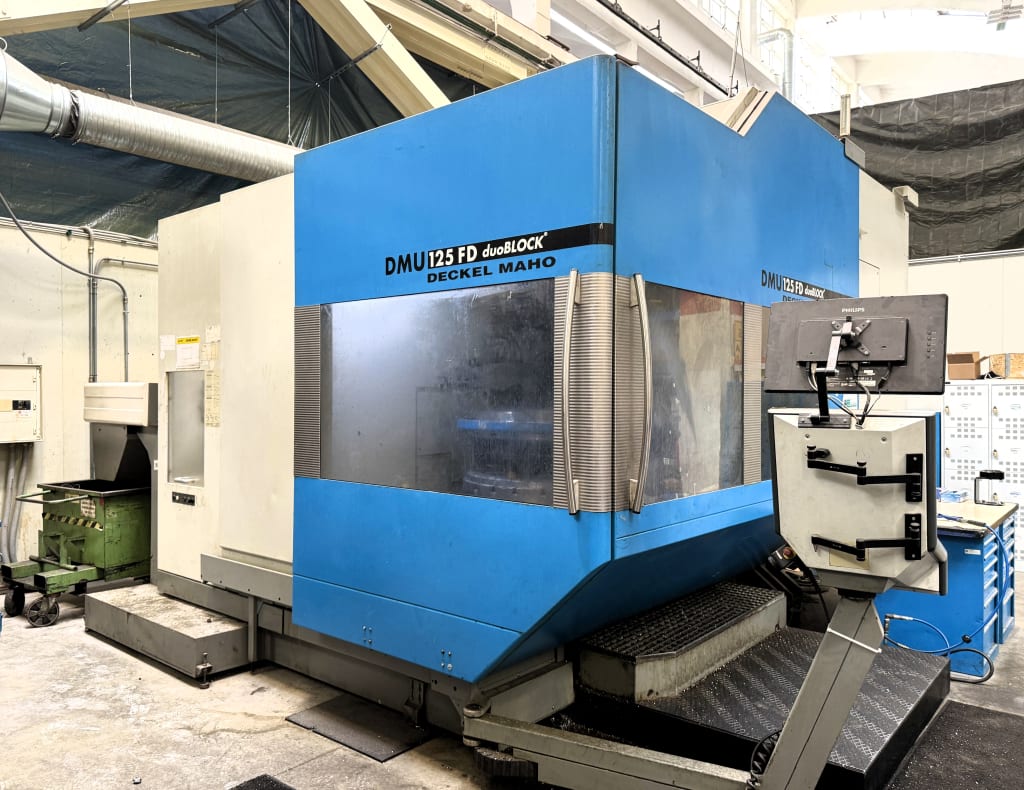 - View2006 Deckel Maho DMU 125 FD duoBLOCK 6-Axis Universal Turn/Mill Machining Centre with Siemens Control'T' Slotted Table Ø1,250 x 1,100mm (11 'T' Slots). Maximum Table Load 2,000kg. Axis Travel 'X'=1,250mm, 'Y'=1,000mm, 'Z'=1,000mm, 'A'= +180/-30°, 'B'=360°. Rapid Traverse 60m/min. Table Turning Speed Range 20-500rpm. Maximum Spindle Speed ...